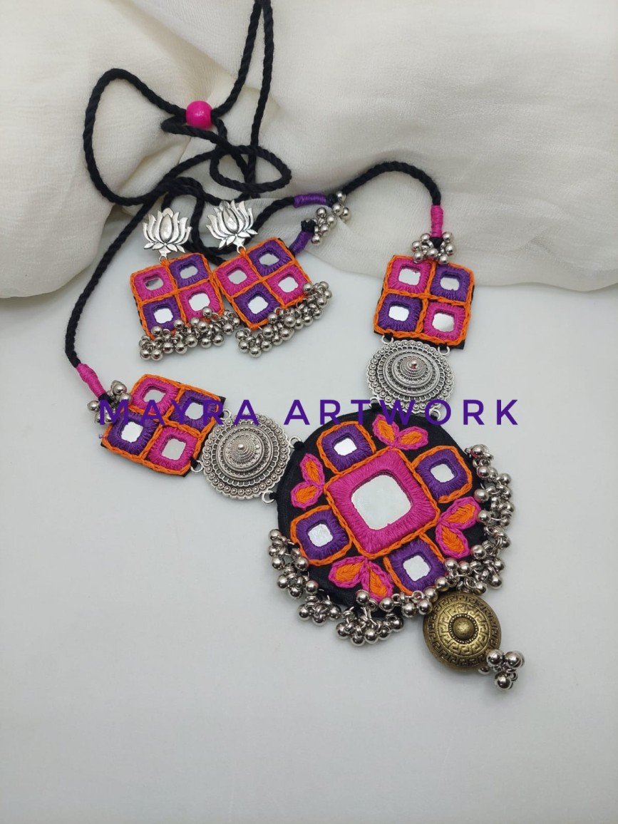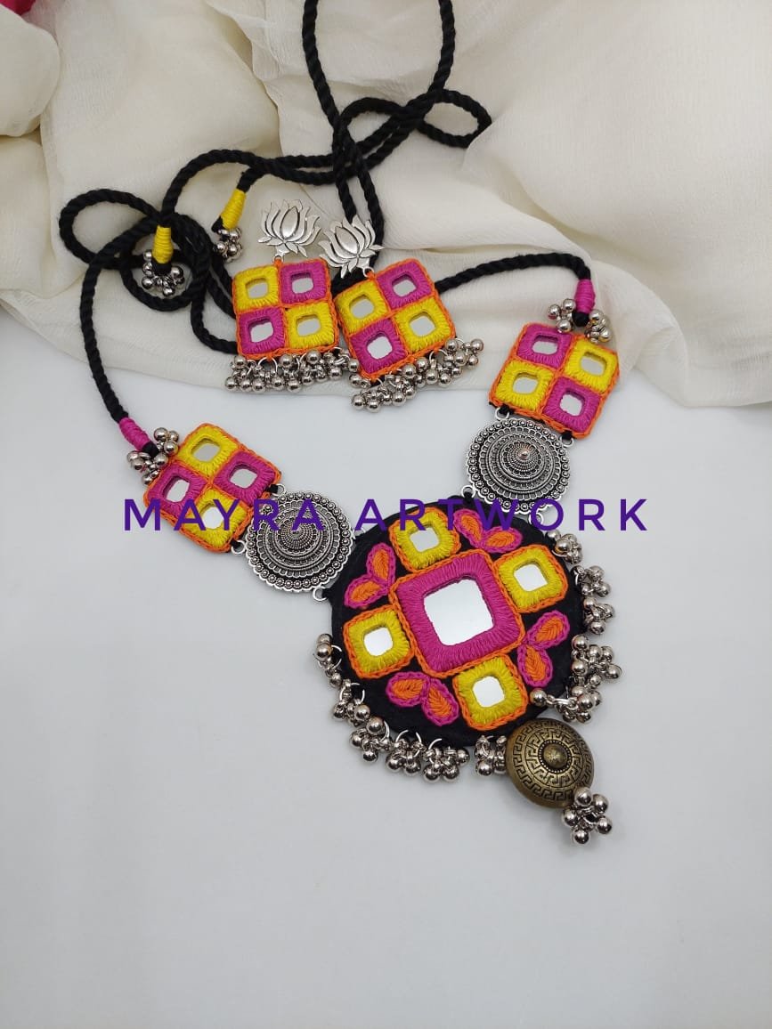 A beautifully handcrafted Necklace and Earrings set featuring traditional threadwork, mirror details, and festive embellishments. Lightweight, vibrant, and perfect for ethnic, Navratri, and wedding looks.