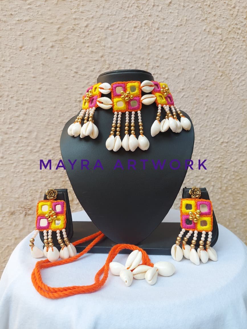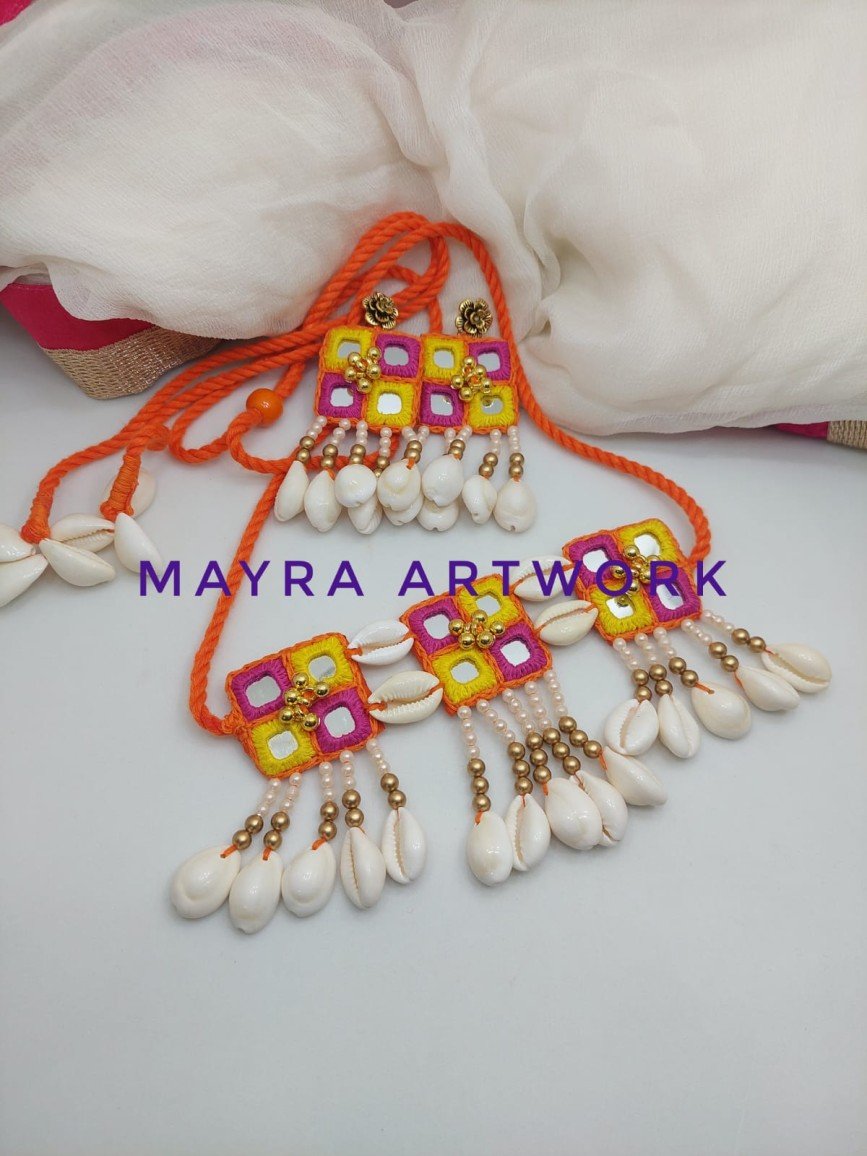 This handcrafted jewellery set is beautifully made using traditional mirror work, colourful thread wrapping, and premium bead detailing. Each set includes a perfectly coordinated Necklace with matching earrings  giving you a complete festive look.