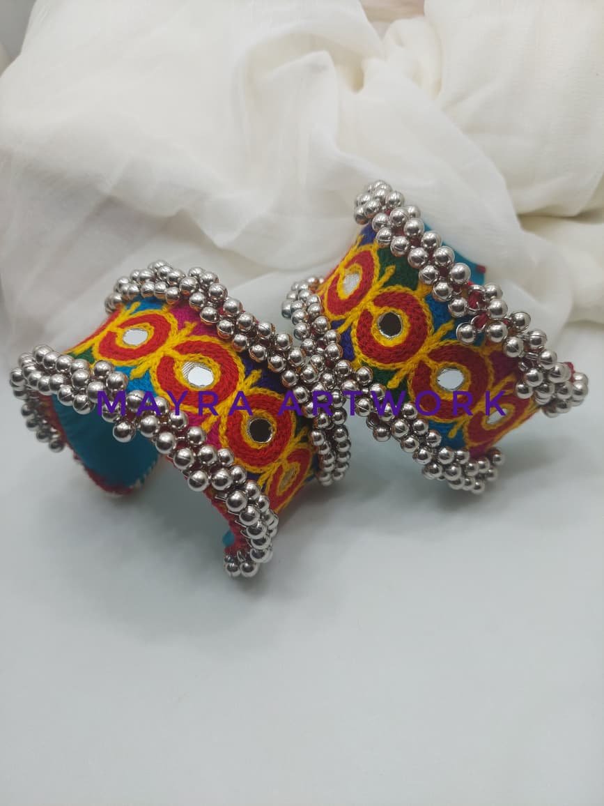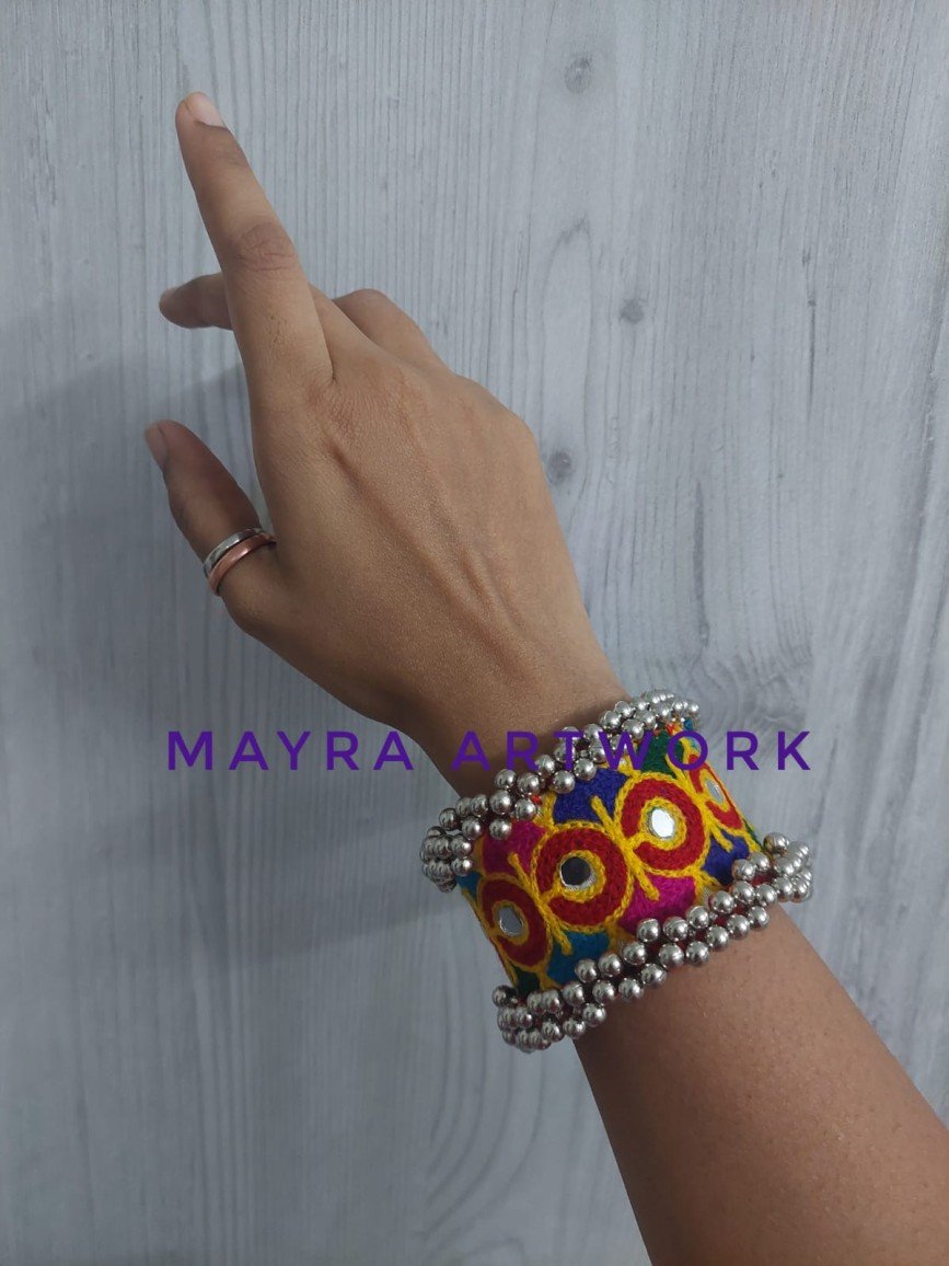 Handcrafted Mirror-work Handcuffs designed with colourful thread embroidery, metal bead detailing, and adjustable fittings. A bold festive accessory perfect for Navratri and ethnic styling.