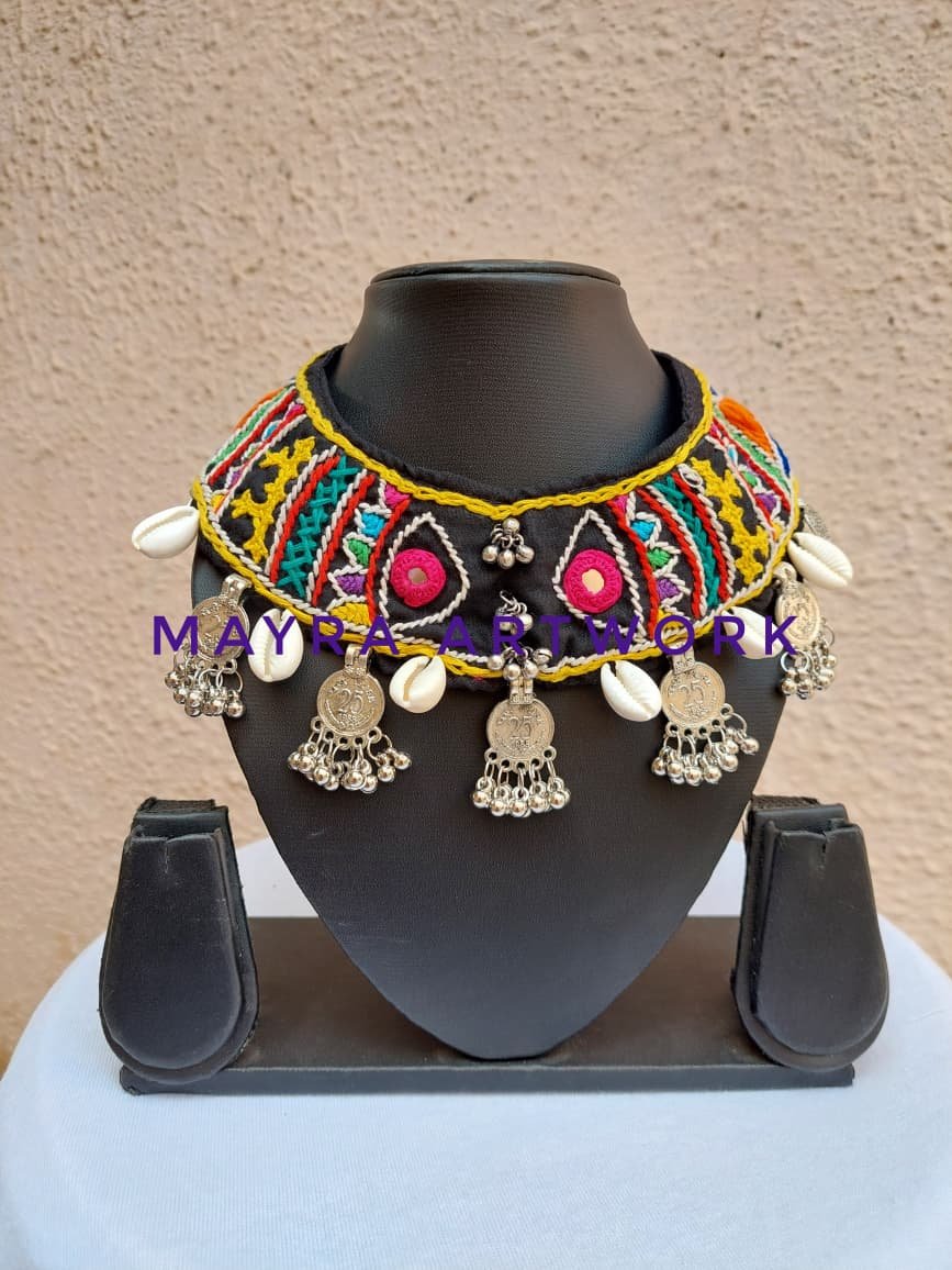 This artisan-made neckpiece blends traditional mirror work with colourful thread detailing, shells, metal charms, and elegant bead accents. Designed for comfort and style, it rests beautifully on the neckline and instantly elevates any festive or ethnic outfit.