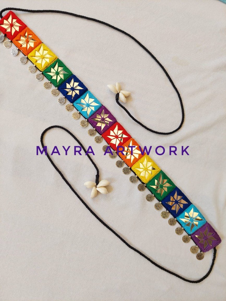 The belt comes with a long adjustable dori, allowing you to tighten or loosen it for the perfect fit. Whether you’re styling it with a lehenga, Navratri chaniya choli, skirt, or fusion wear, this waist belt adds a bold and vibrant touch to your entire look.