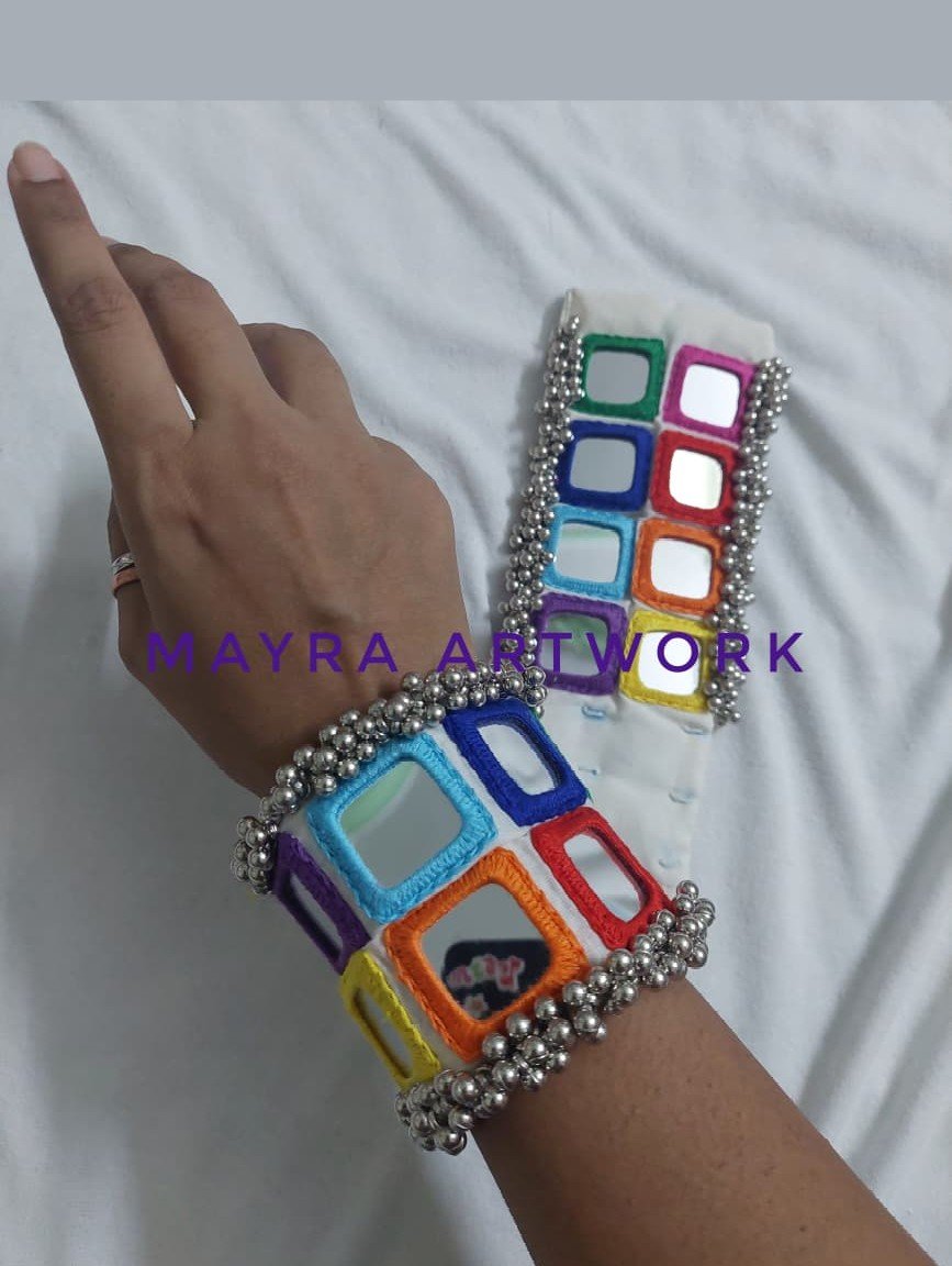 These handcrafted handcuffs Pair of 2 are designed using traditional mirror work, vibrant thread embroidery, and detailed metal bead embellishments, creating a bold and stylish statement accessory. Each piece is artisan-made and sits comfortably on the wrist, adding a colourful and festive touch to your look.