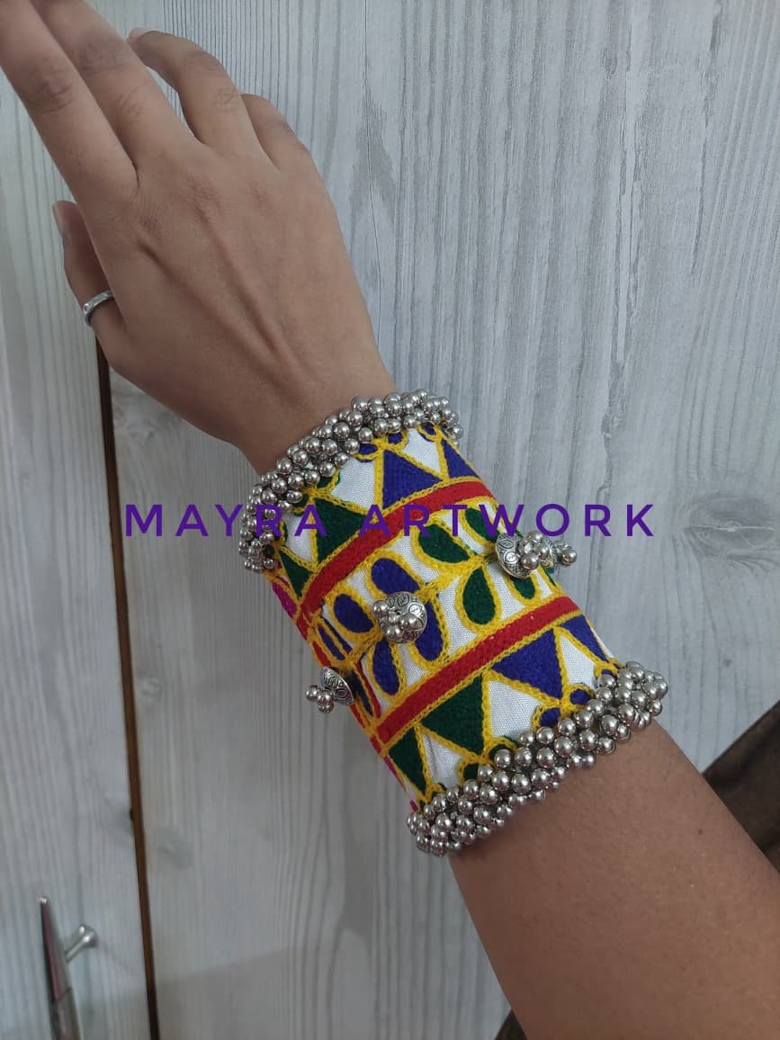 Handcrafted Mirror-work Handcuffs designed with colourful thread embroidery, metal bead detailing, and adjustable fittings. A bold festive accessory perfect for Navratri and ethnic styling.