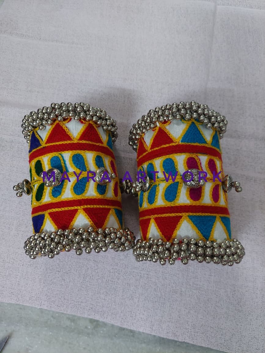 These handcrafted handcuffs Pair of 2 are designed using traditional mirror work, vibrant thread embroidery, and detailed metal bead embellishments, creating a bold and stylish statement accessory. Each piece is artisan-made and sits comfortably on the wrist, adding a colourful and festive touch to your look.