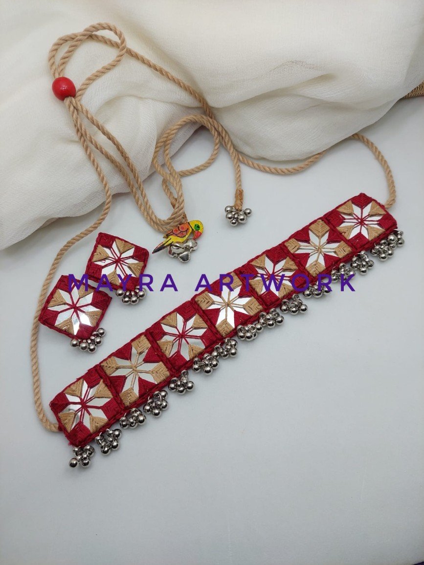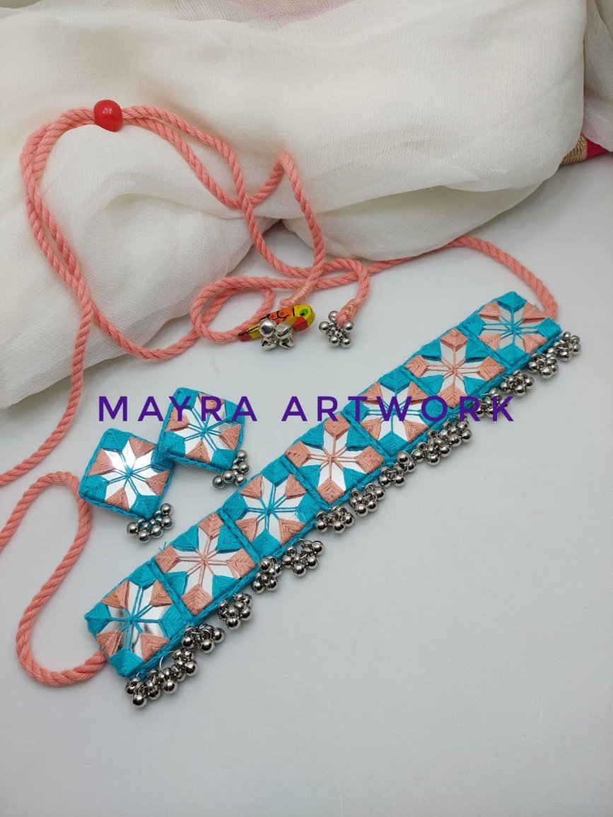 A beautifully handcrafted Choker set with matching Earrings, designed with traditional mirror work, colorful thread detailing, beads, and charms. Lightweight, vibrant, and perfect for festive, Navratri, and ethnic looks.