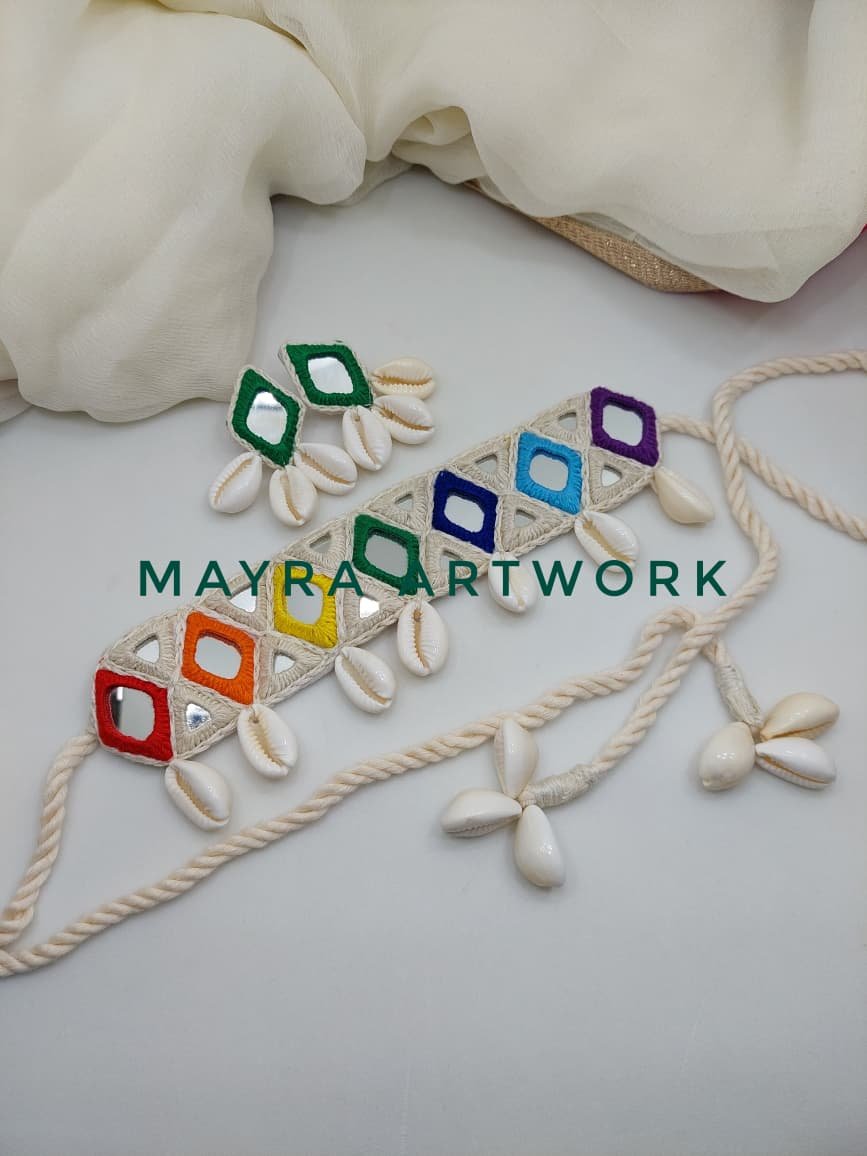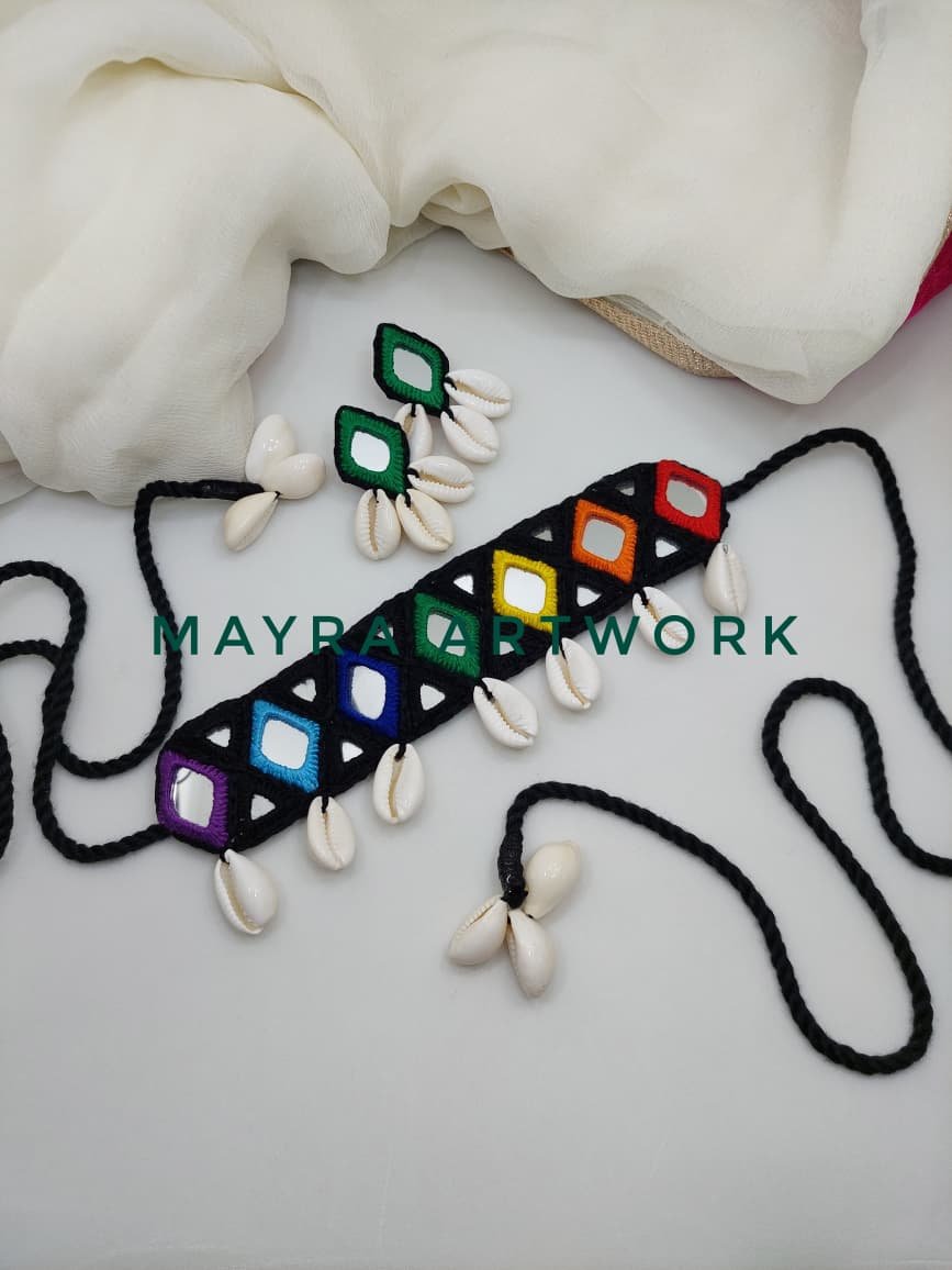 A beautifully handcrafted Choker set with matching Earrings, designed with traditional mirror work, colorful thread detailing, beads, and charms. Lightweight, vibrant, and perfect for festive, Navratri, and ethnic looks.