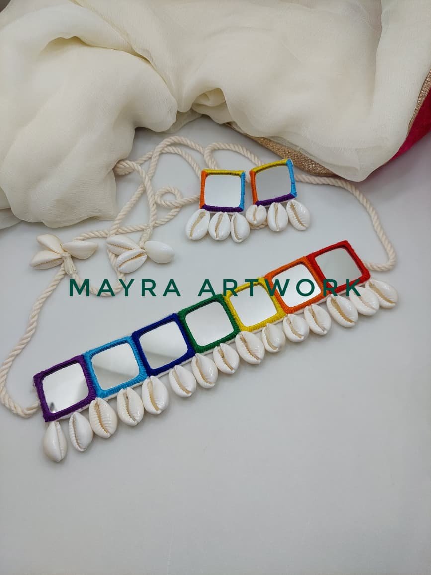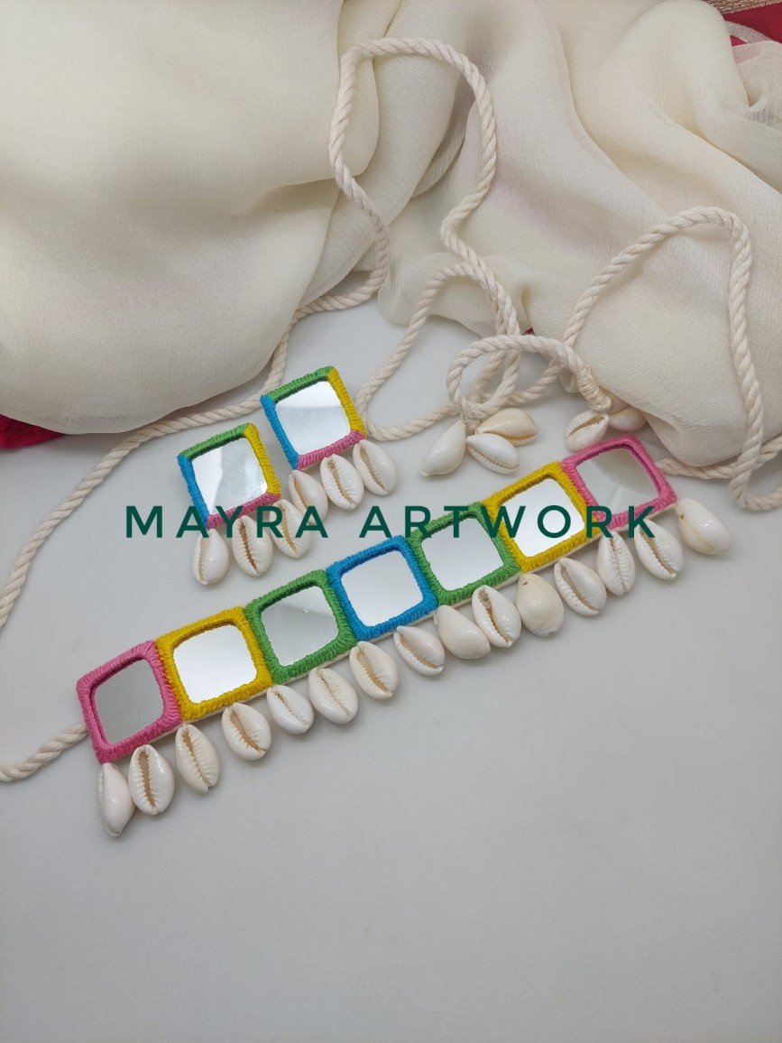 his handcrafted necklace and earrings set is designed using rich traditional craftsmanship and vibrant colours. Each piece features detailed threadwork, mirror elements, beads, shells, or silver-toned charms—creating a bold and festive statement. Made by skilled artisans, the set is lightweight, comfortable, and adds an instant ethnic touch to any outfit.