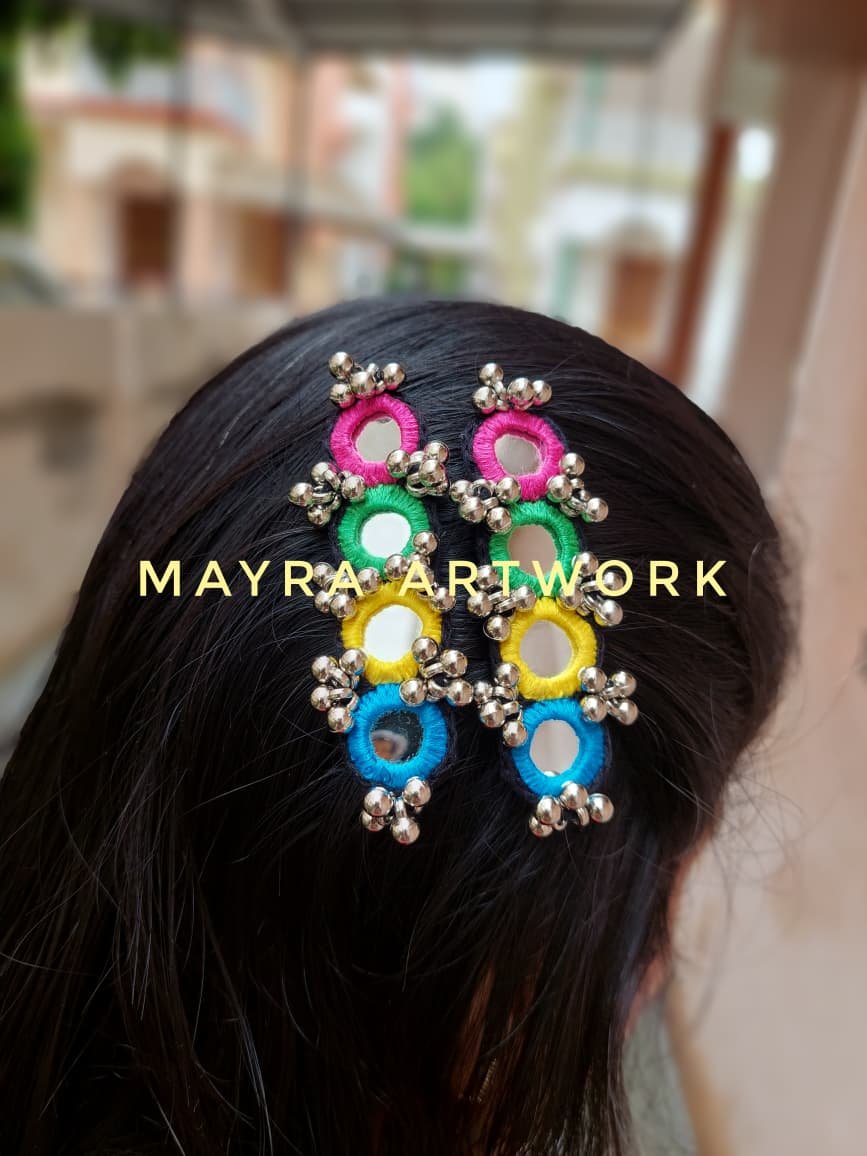 A beautifully handcrafted mirror-work hair clip made with vibrant threadwork and an easy-to-use alligator pin at the back. Perfect for festive hairstyles, Garba looks, and traditional outfits.