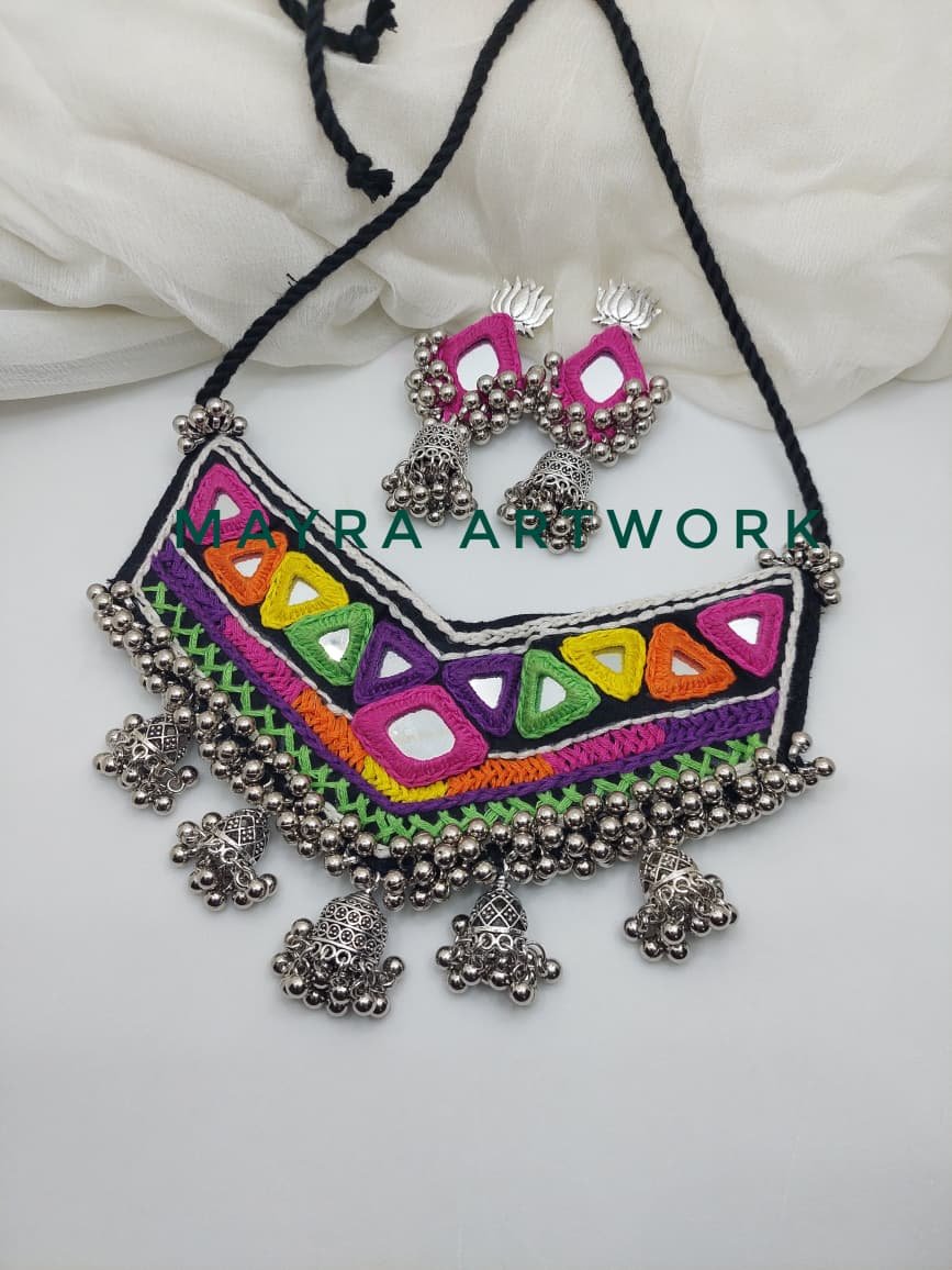 A beautifully handcrafted Necklace and Earrings set featuring traditional threadwork, mirror details, and festive embellishments. Lightweight, vibrant, and perfect for ethnic, Navratri, and wedding looks.