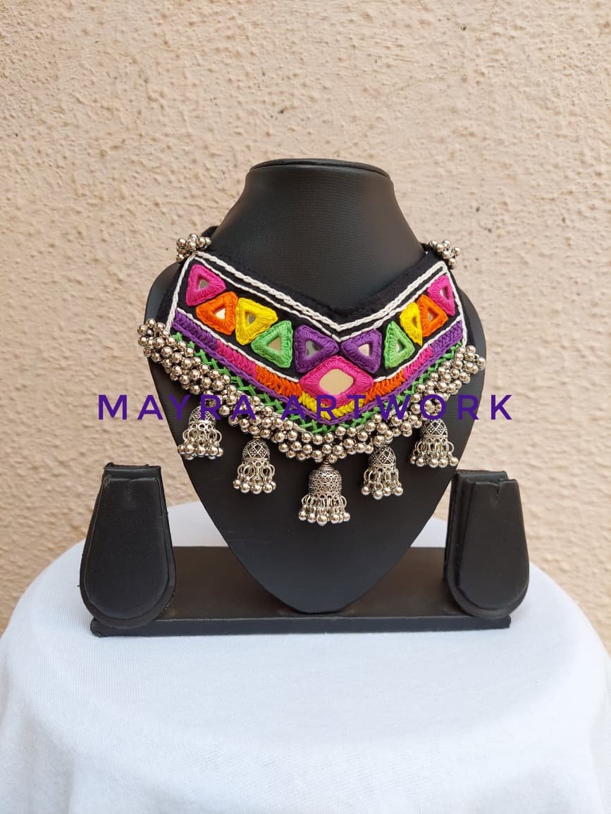 his handcrafted necklace and earrings set is designed using rich traditional craftsmanship and vibrant colours. Each piece features detailed threadwork, mirror elements, beads, shells, or silver-toned charms—creating a bold and festive statement. Made by skilled artisans, the set is lightweight, comfortable, and adds an instant ethnic touch to any outfit.