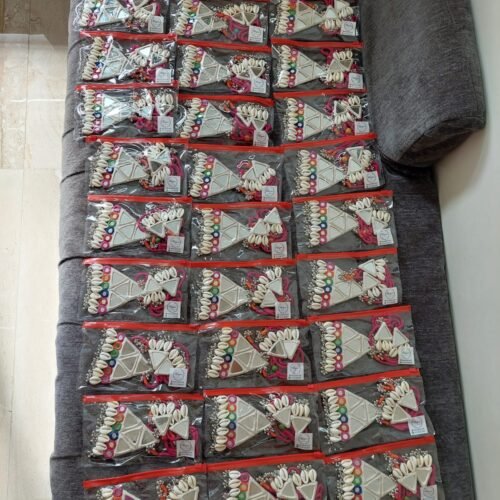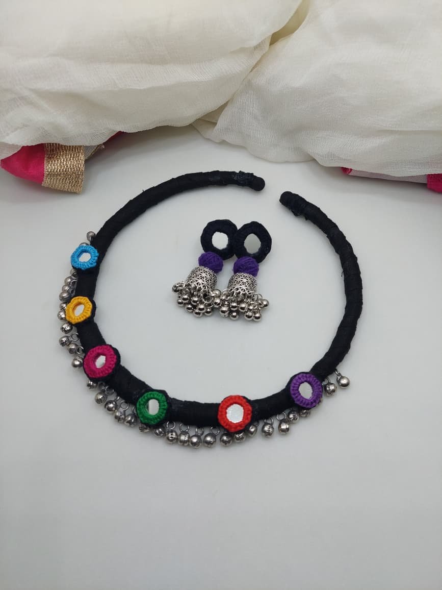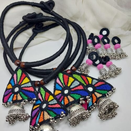 This handcrafted necklace and earrings set is designed using rich traditional craftsmanship and vibrant colours. Each piece features detailed threadwork, mirror elements, beads, shells, or silver-toned charms—creating a bold and festive statement. Made by skilled artisans, the set is lightweight, comfortable, and adds an instant ethnic touch to any outfit.