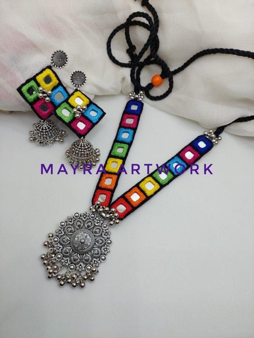 A beautifully handcrafted Necklace and Earrings set featuring traditional threadwork, mirror details, and festive embellishments. Lightweight, vibrant, and perfect for ethnic, Navratri, and wedding looks.