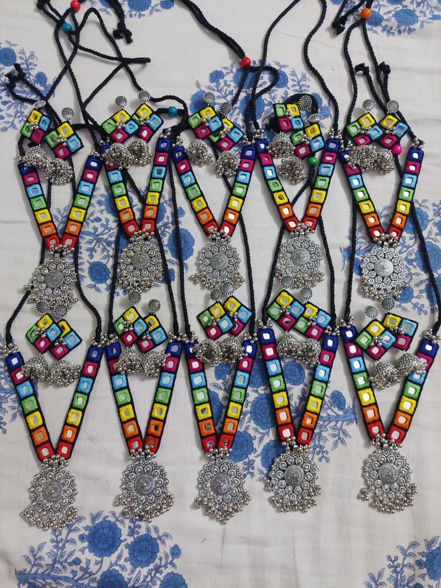 his handcrafted necklace and earrings set is designed using rich traditional craftsmanship and vibrant colours. Each piece features detailed threadwork, mirror elements, beads, shells, or silver-toned charms—creating a bold and festive statement. Made by skilled artisans, the set is lightweight, comfortable, and adds an instant ethnic touch to any outfit.