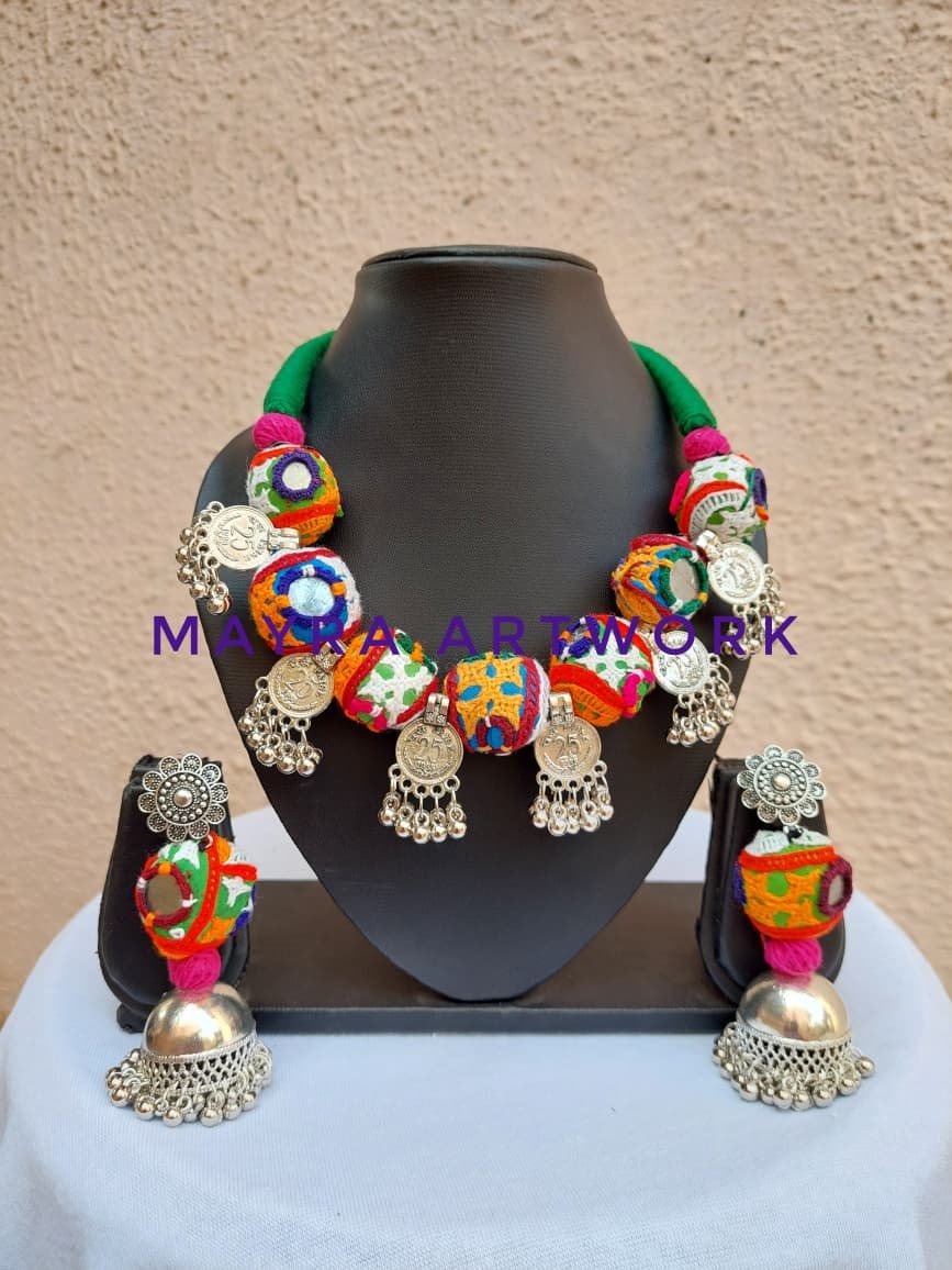 A beautifully handcrafted Necklace and Earrings set featuring traditional threadwork, mirror details, and festive embellishments. Lightweight, vibrant, and perfect for ethnic, Navratri, and wedding looks.