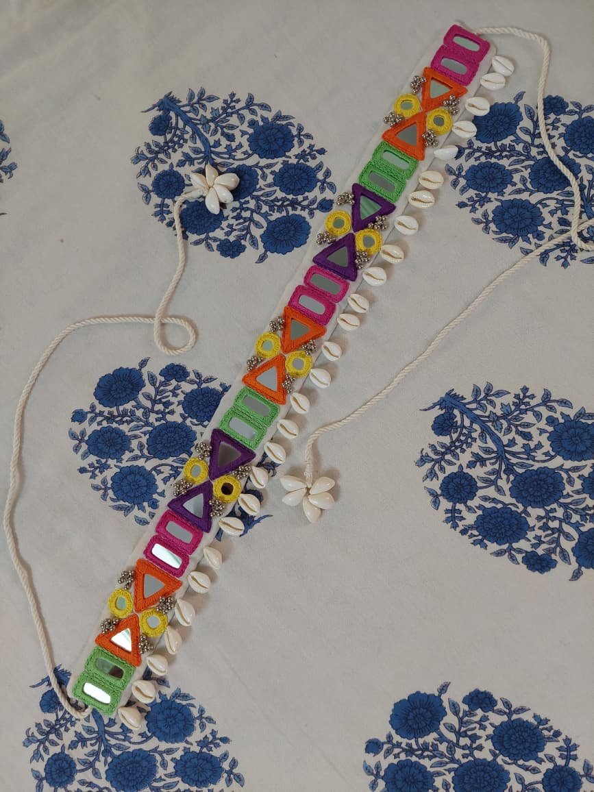 Introducing the Vrinda Waist Belt, a beautifully handcrafted accessory designed to elevate your festive and traditional outfits. Made using colorful mirror-work squares and paired with antique silver beads, this belt blends traditional artistry with modern styling.
